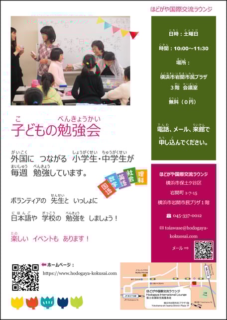 外国に つながる 小学生・中学生が、ボランティアと いっしょに 学校の 勉強や 学校生活に 必要な 日本語を 勉強しています。