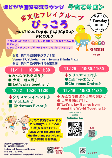 小さい子どもを持つ 外国人と 日本人の保護者のみなさんが、一緒に 情報を交換したり、自分の国の 文化 紹介したりして、遊びながら 楽しく過ごします。日本語だけ、母国語だけ 話す 人も、日本語を 学んでいる 人も、みんなで お話してみませんか?
