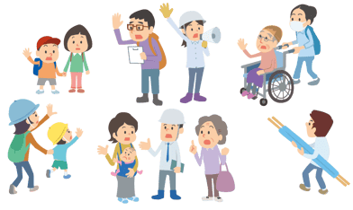 大きな災害がおきたとき、自分や家族を守ることが一番大切です。でも、ひとりだけではできないこと、大変なこともあります。そんなとき、近所の人たちで、おたがいに たすけあうことが大切です。
